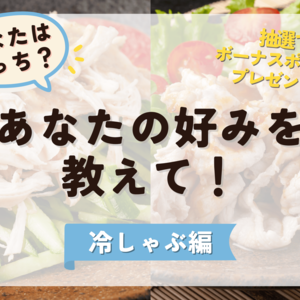LMC9月の投稿テーマ「残暑にあなたが食べている肉料理」にちなんで 冷しゃぶにまつわるあなたの好みを2択で教えてください! 4つの質問すべて回答してくれた方の中から抽選で5名様にボーナスポイント10ポイントプレゼント🎁&...